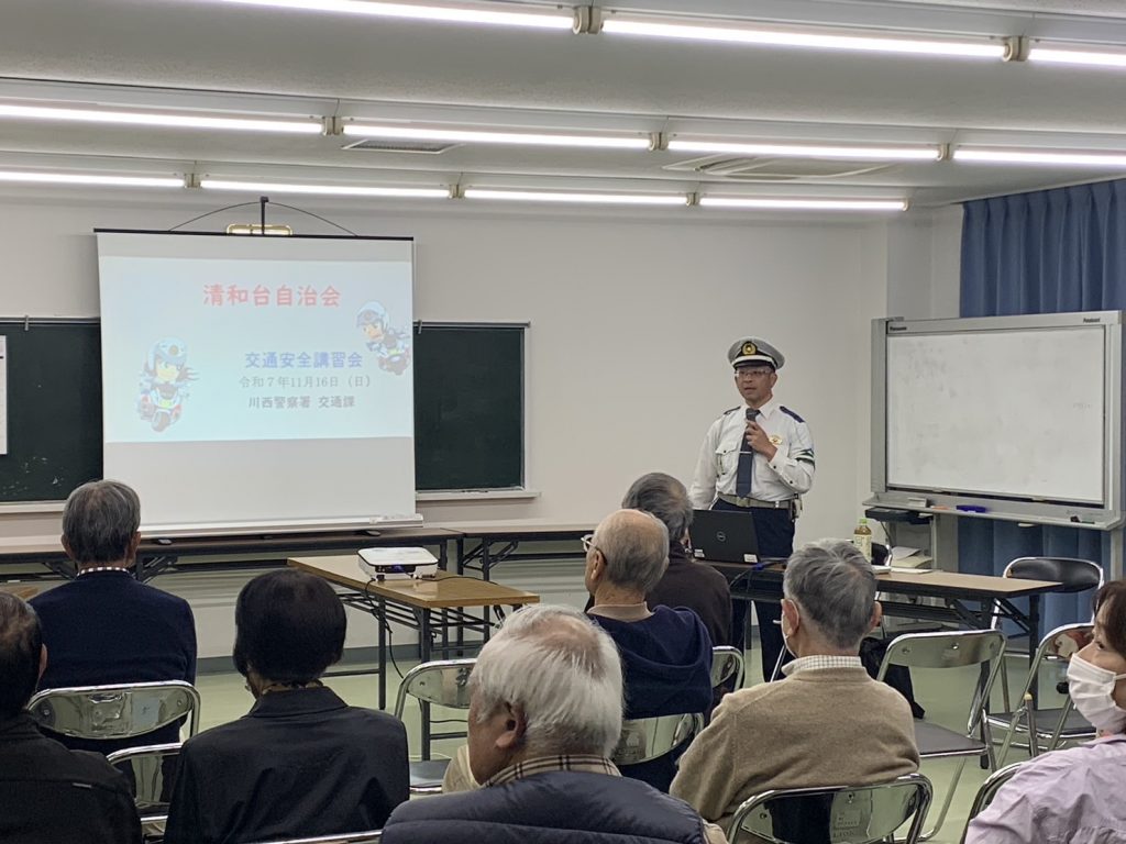 20251116日、清和台第2自治会館で交通安全講習会が開催されました。講師に川西警察署交通課の和田警部補をお迎えし、地域からは20名が参加しました。 川西市では2024年に交通事故による死亡事故は2件で3名が亡くなりました。事故の多くは交差点やその付近、特に夕方に発生しており、追突や右折時の事故が目立ちます。 自転車事故では、ヘルメット未着用による死亡例がありました。兵庫県の着用率は7.7%と低く、全国でワースト3位。20264月からは信号無視やスマホの注視、大音量イヤフォン使用などに反則金が科される制度が始まります。202411月には道交法が改正され、自転車の携帯電話使用禁止や酒気帯び運転への罰則が強化されました。 質疑応答では、清和台東4交差点付近の信号について質問が集中しました。ドラッグストア向かい(東側)にある信号は、自転車の二段階右折用であり、車はその信号に従う必要はありません。つまり、赤信号でも車は左折・直進が可能です。ただし路外施設から直進する場合は右折車が優先となるため注意が必要です。また北側から来た車がUターンや右折して施設に入ることは違反ではありませんが、交通量が多いため推奨されません。一時停止も忘れずに! 交通ルールを正しく理解し、地域みんなで安全なまちづくりを進めましょう!
